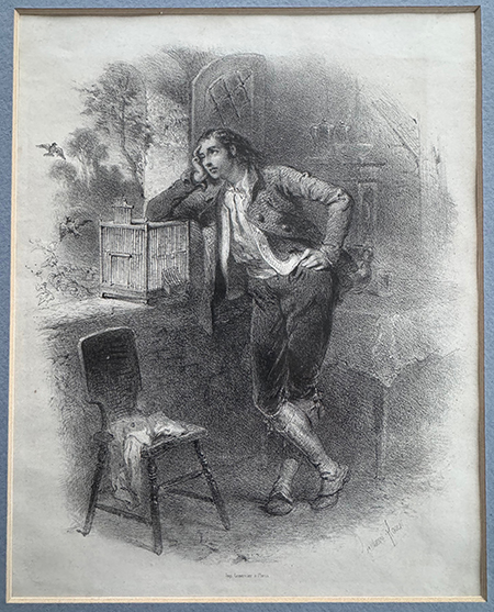 Gustav Janet (French, 1829–1898) Finally and Wistfully Releasing his Captive Birds Lithograph Gustav Janet was an illustrator, wood engraver, and lithographer. He worked for L'Illustration, the first illustrated newspaper in France, launched in 1843. He provided drawings to La Revue de la Mode, the London Illustrated Times (1855-1856), and the Illustrated London News (1867-1871). His lithographs were published in the 1850’s by Bertauts and Aubert, then by Lemercier. |