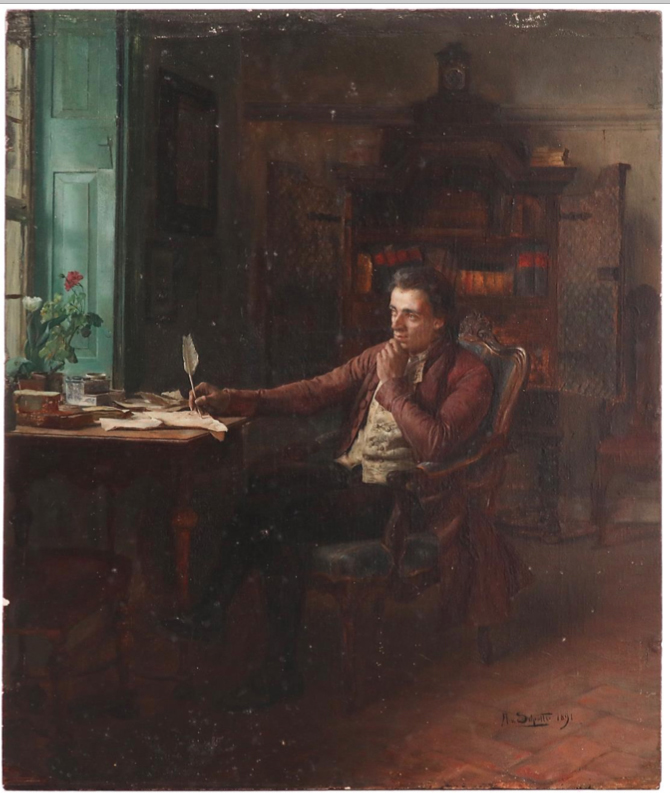 Alfred von Schrötter (German, 1856-1935) The Poet in His Study, dated 1891 Oil painting on a wood panel Alfred Schrötter studied painting from 1872–1877 at the Viennese Academy of Fine Art. From 1879 she studied at the Munich Academy of Fine Arts. In 1900 he became the leader of the drawing program at the Academy in Graz, Austria. From 1907–1923 was widely active and well regarded as an exceptional teacher and influenced a generation of artists. |