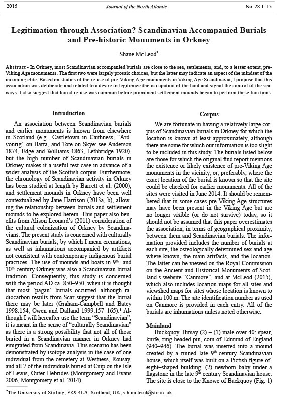 Abstract - In Orkney, most Scandinavian accompanied burials are close to the sea, settlements, and, to a lesser extent, pre-
