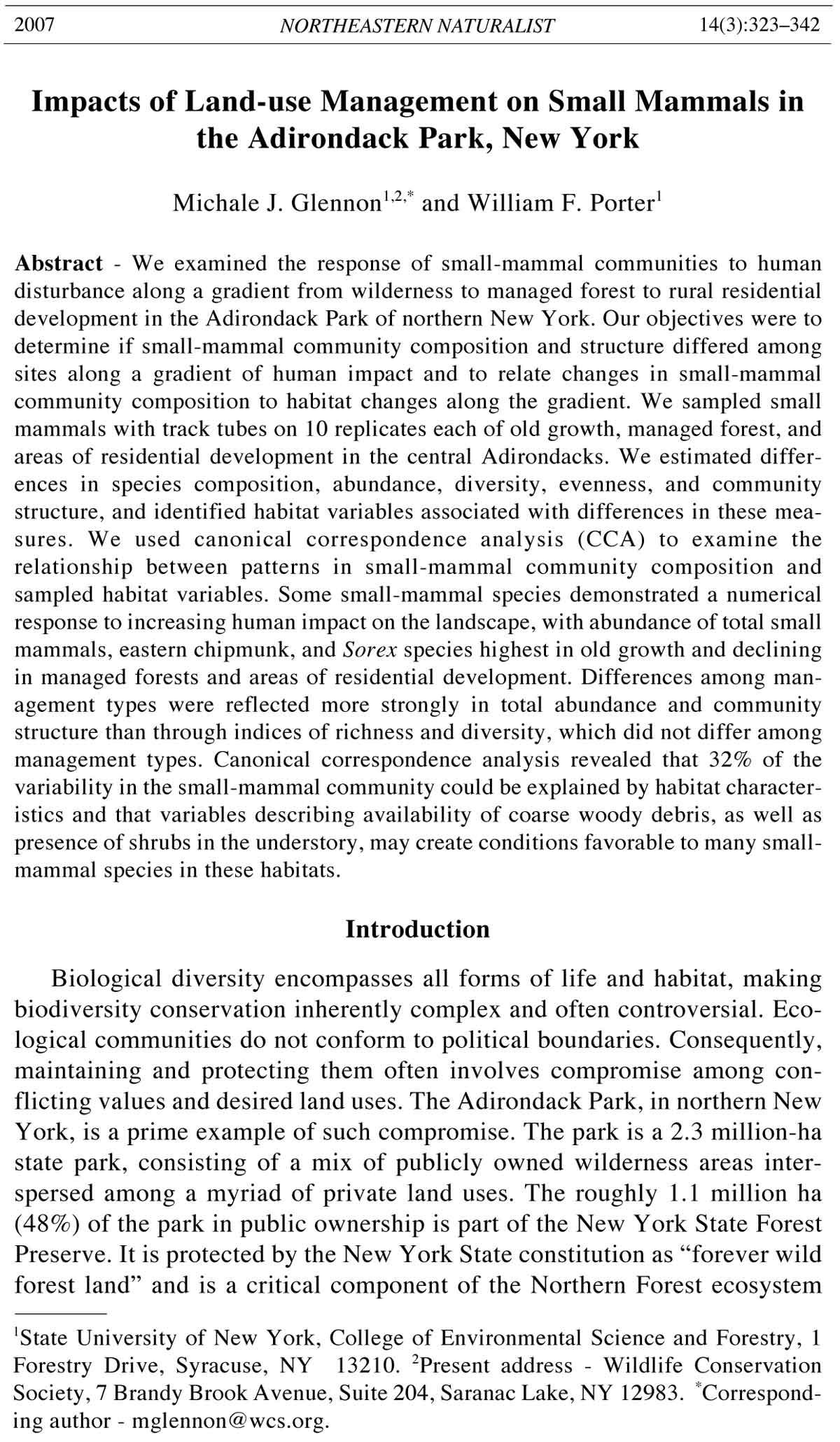 Forestry Drive, Syracuse, NY 13210. 2Present address - Wildlife Conservation