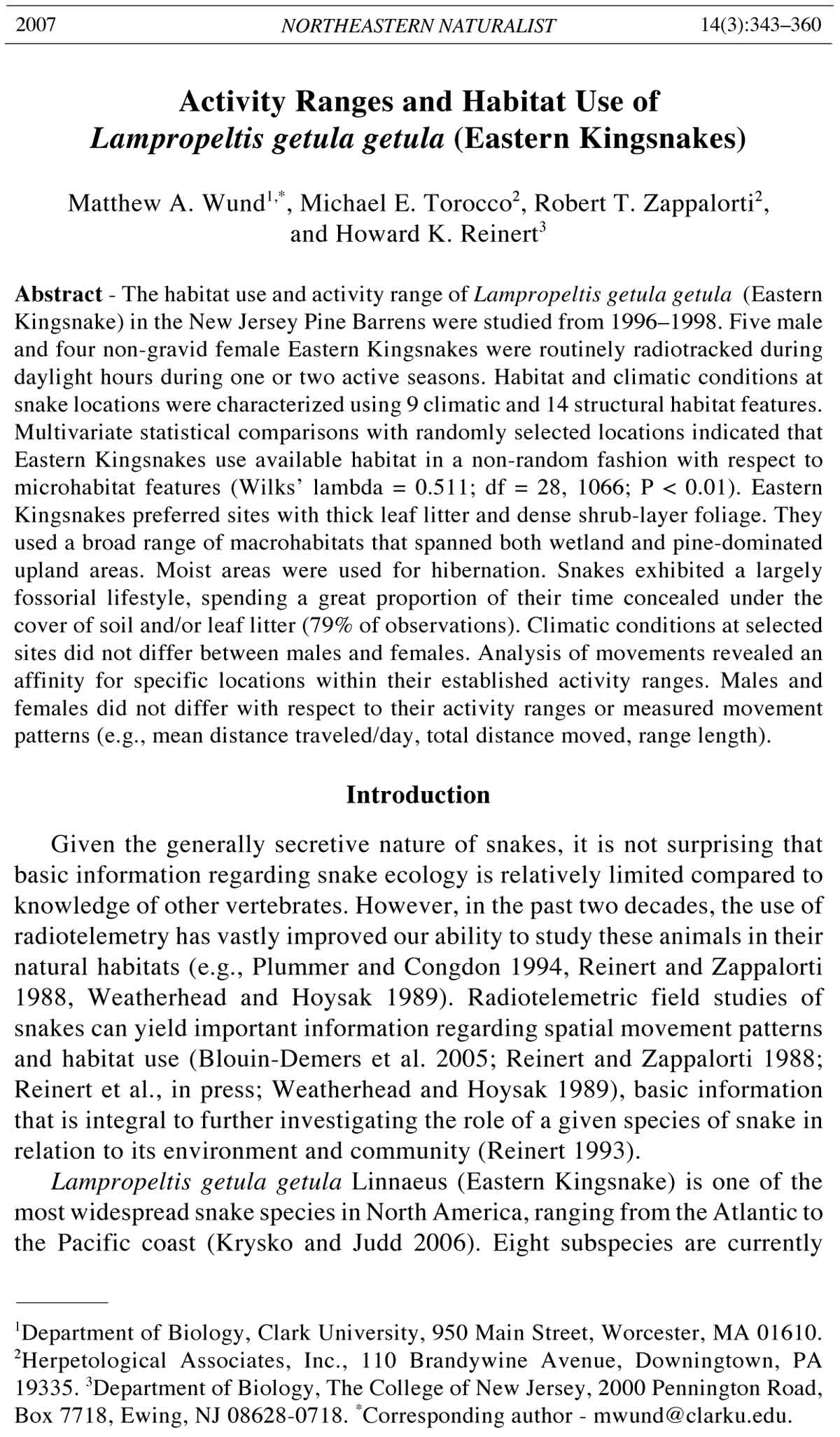 Matthew A. Wund, Michael E. Torocco, Robert T. Zappalorti, and Howard K. Reinert