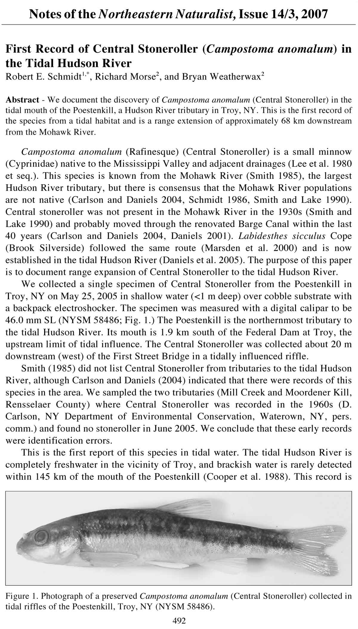 Smith (1985) did not list Central Stoneroller from tributaries to the tidal Hudson