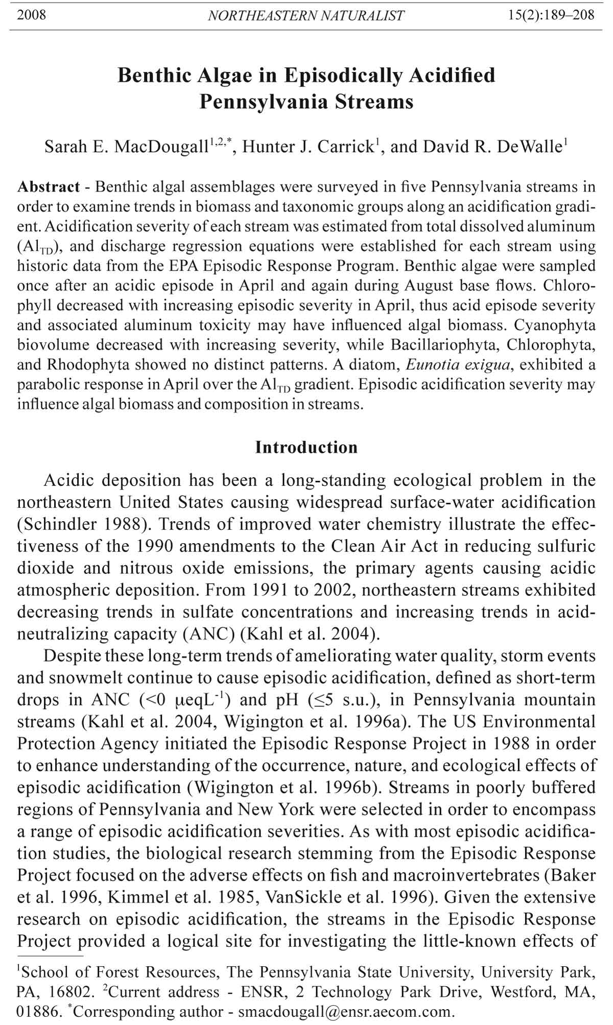 Wigington, P.J., D.R. DeWalle, P.S. Murdoch, W.A. Kretser, H.A. Simonin, J.