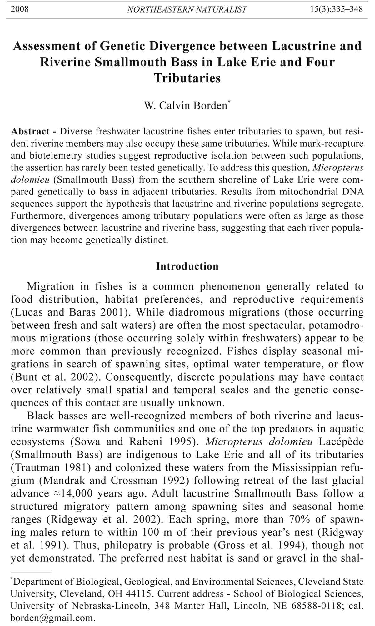 lacustrine Smallmouth Bass diverged genetically, and (2) are Smallmouth