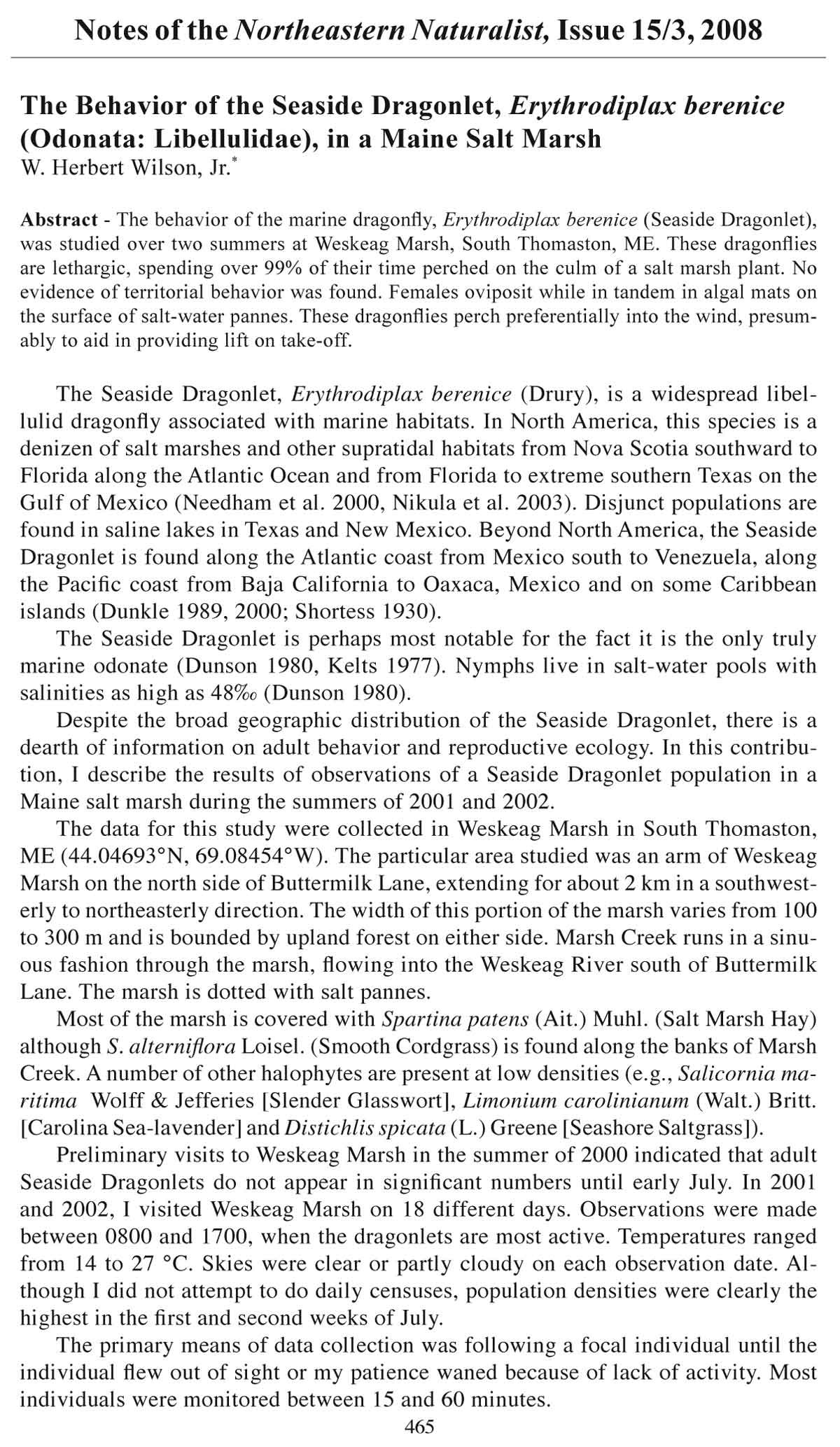 was studied over two summers at Weskeag Marsh, South Thomaston, ME. These dragonflies