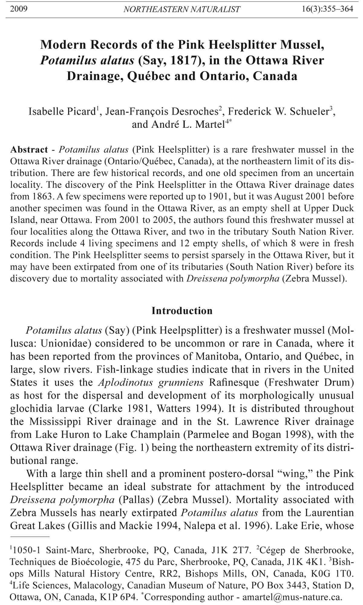 locality. The discovery of the Pink Heelsplitter in the Ottawa River drainage dates