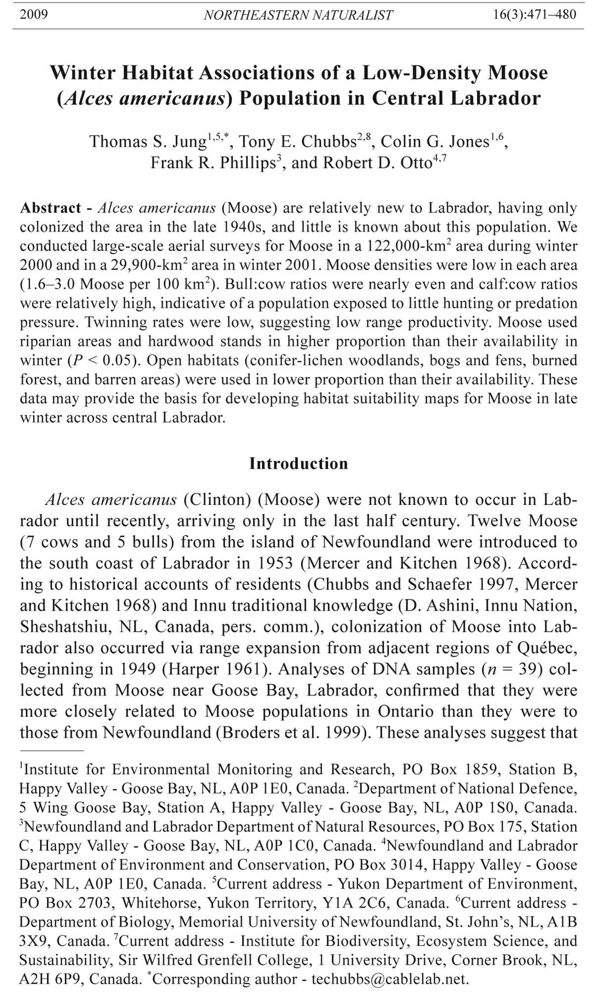 Abstract - Alces americanus (Moose) are relatively new to Labrador, having only