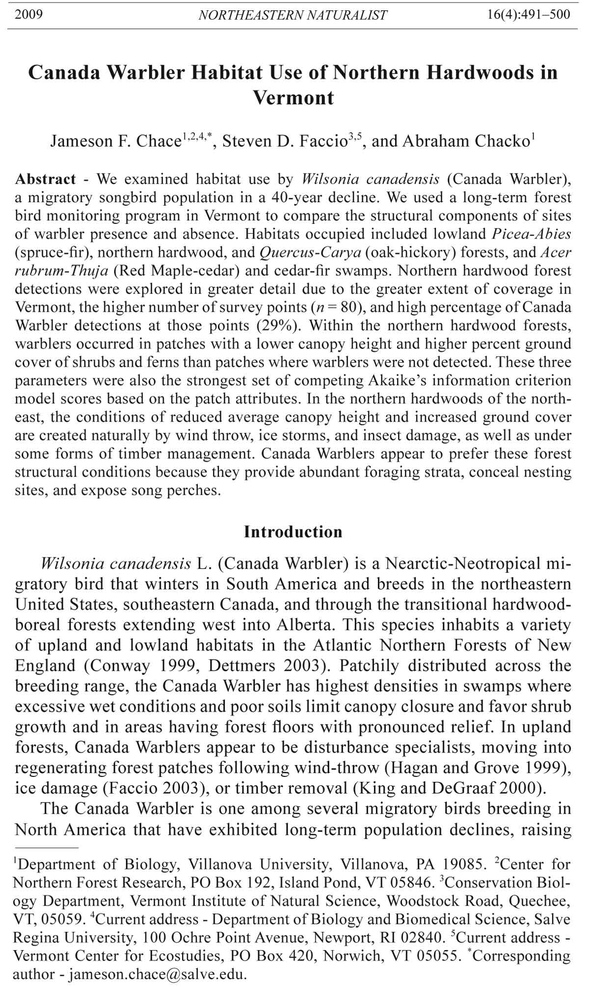 Miller, N.A. 1999. Landscape and habitat predictors of Canada Warbler (Wilsonia