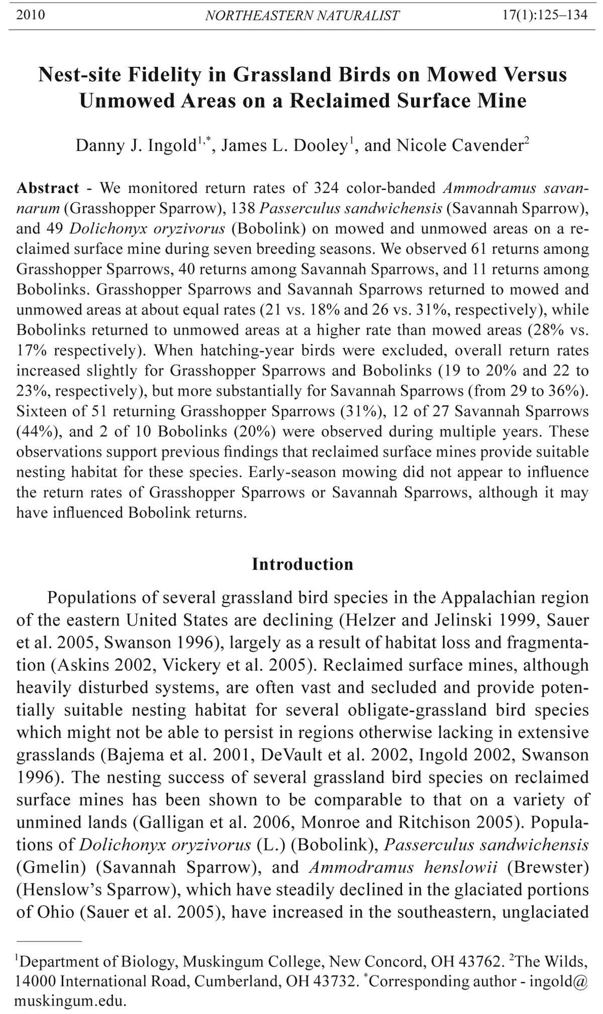 Ingold, D.J. 2002. Use of a reclaimed stripmine by grassland-nesting birds in eastcentral