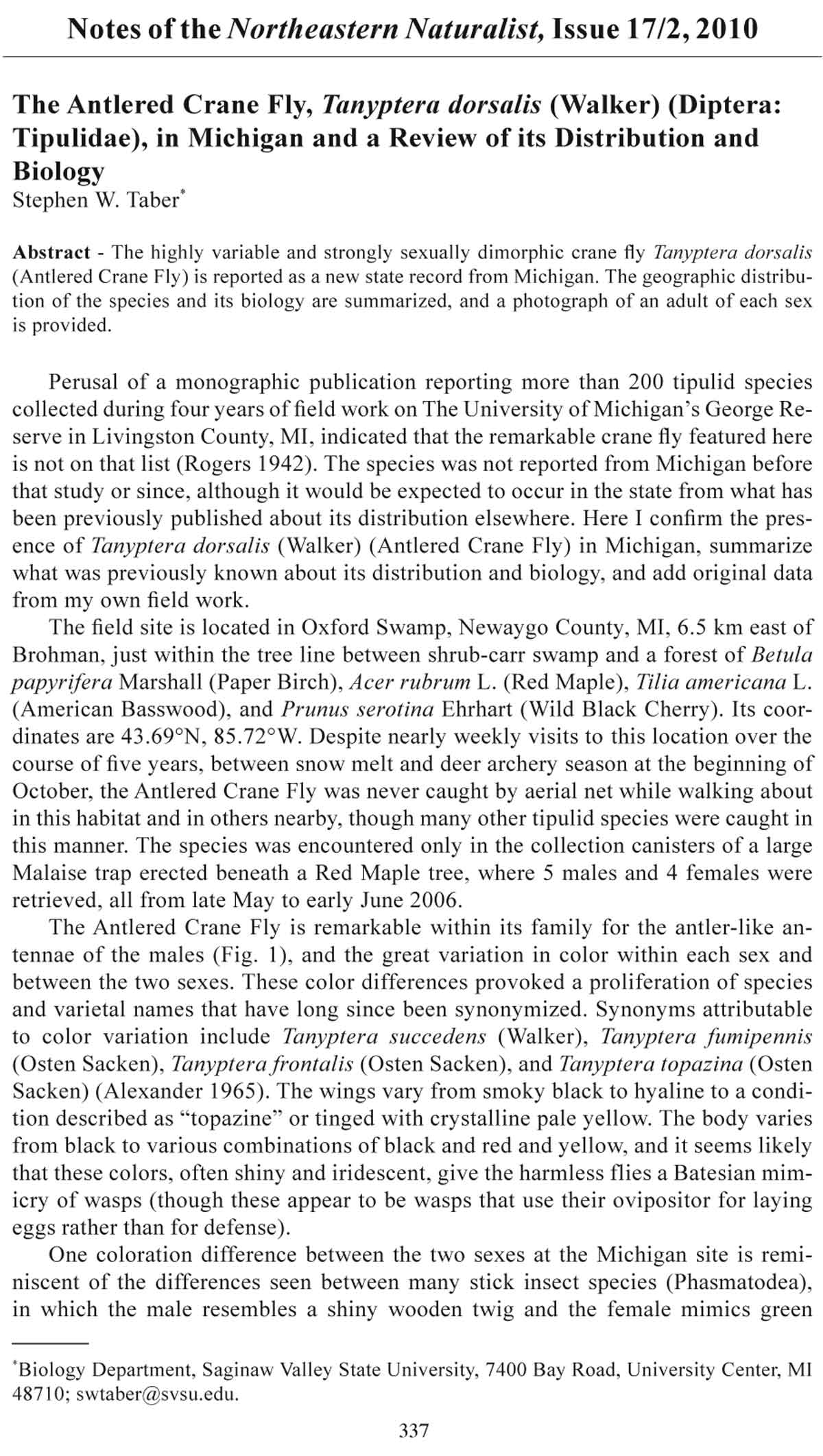of Tanyptera dorsalis (Walker) (Antlered Crane Fly) in Michigan, summarize
