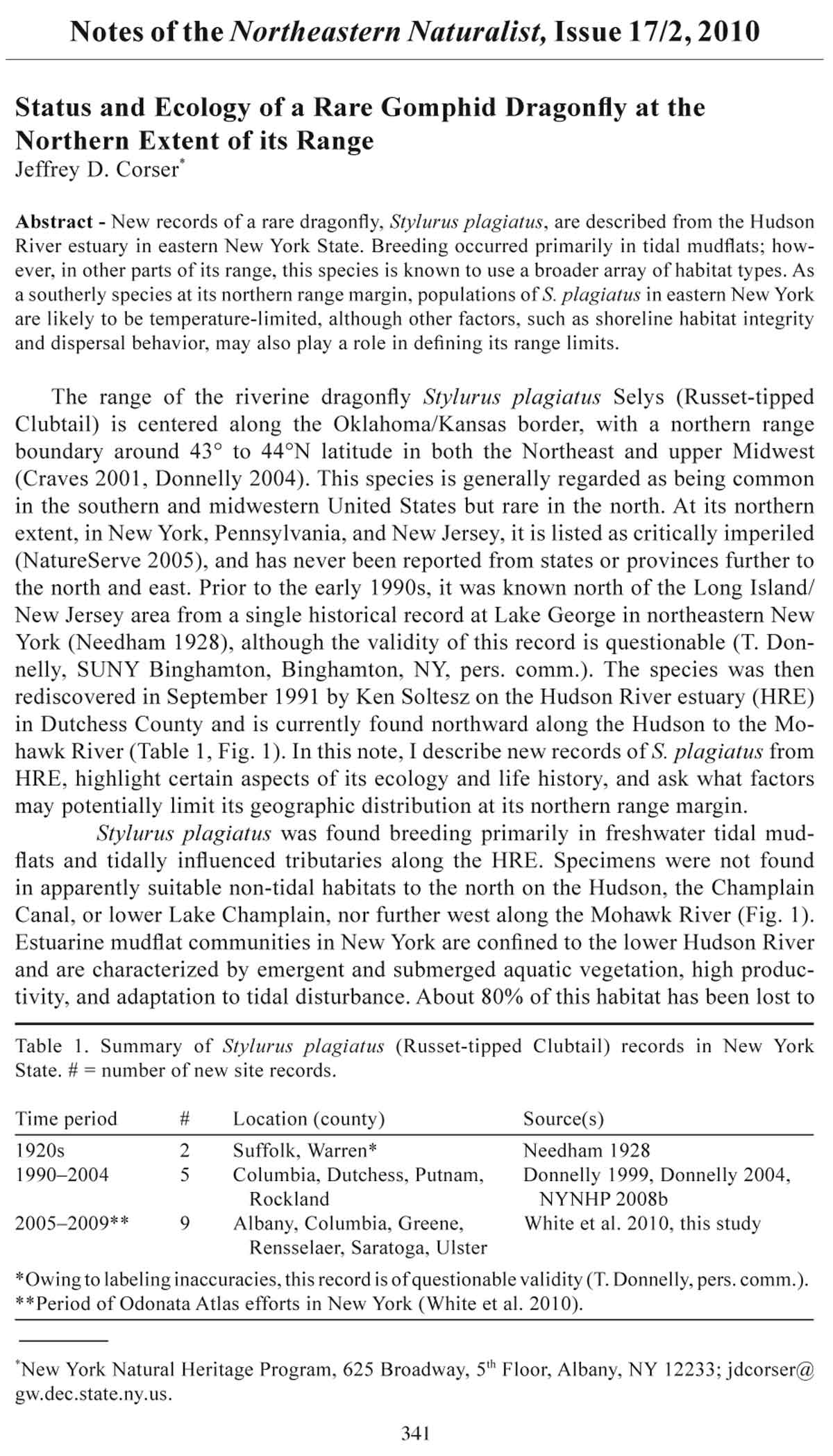 Table 1. Summary of Stylurus plagiatus (Russet-tipped Clubtail) records in New York
