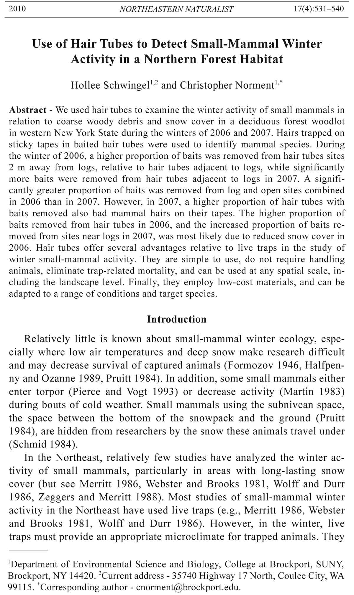 Abstract - We used hair tubes to examine the winter activity of small mammals in