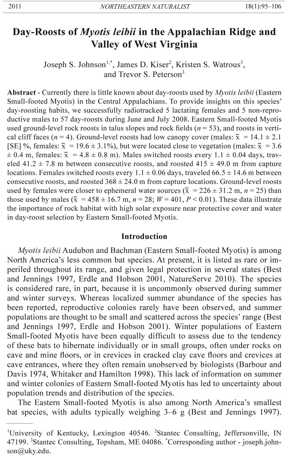 Abstract - Currently there is little known about day-roosts used by Myotis leibii (Eastern