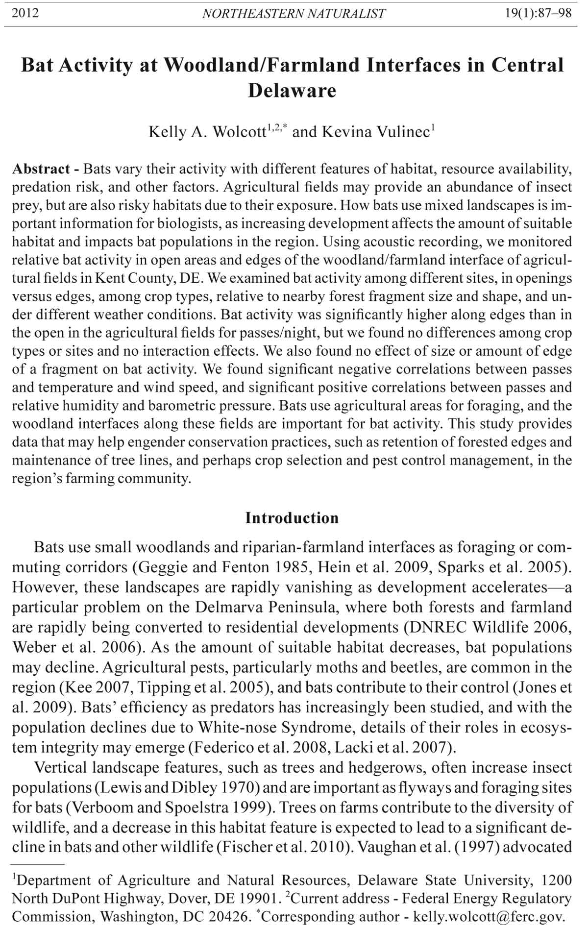 Wolcott, K.A. 2008. Foraging activity of insectivorous bats at the woodland/farmland