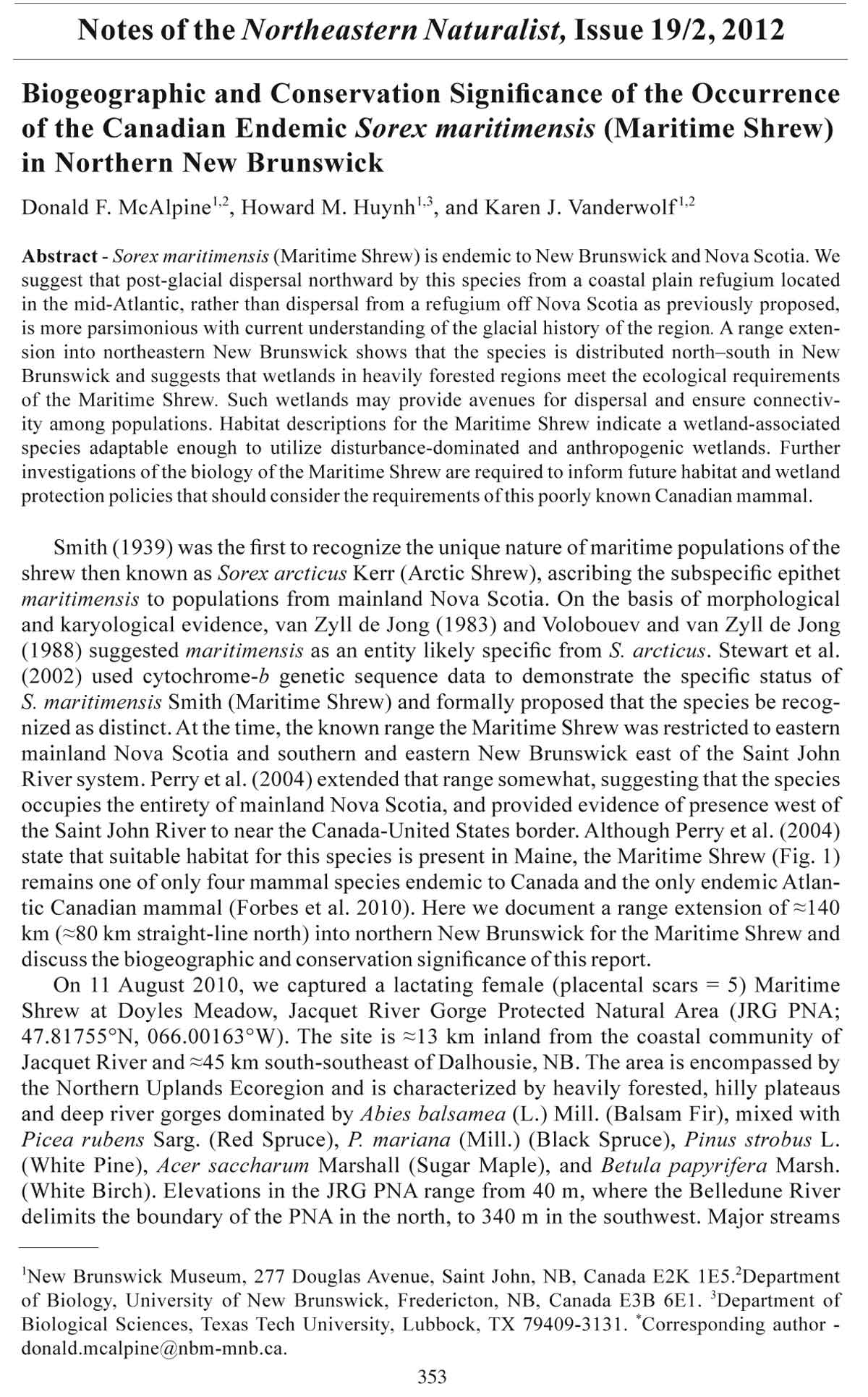 Abstract - Sorex maritimensis (Maritime Shrew) is endemic to New Brunswick and Nova Scotia. We