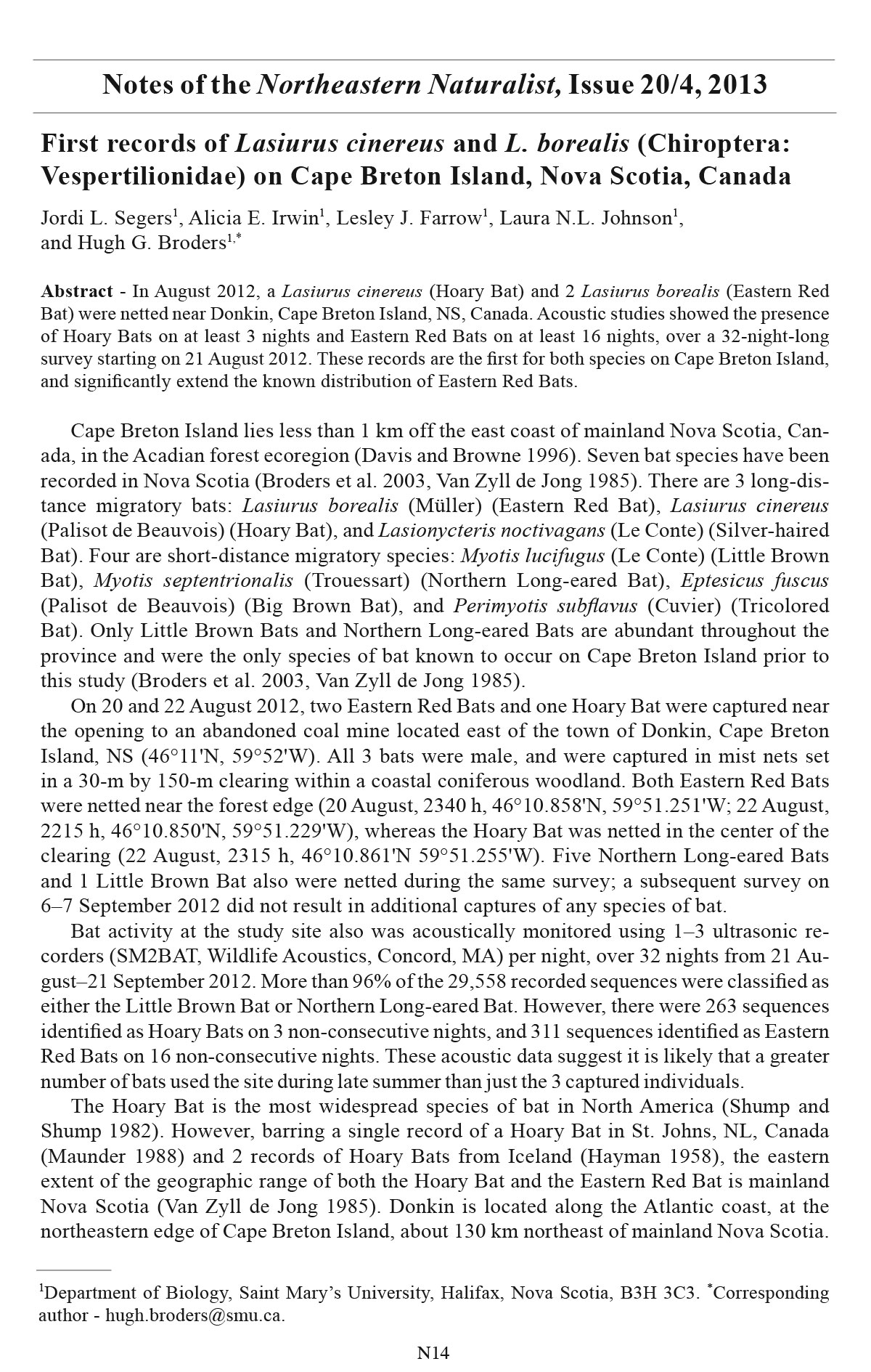 and the first records of both the Hoary Bat and the Red Bat on Cape Breton Island.