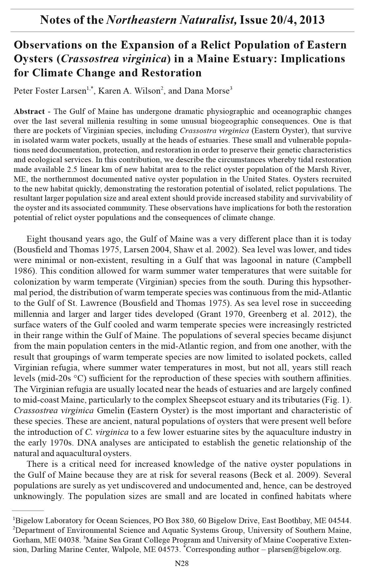Cowger, J. 1975. Natural occurrence of the American Oyster, Crassostrea virginica, in Maine and its