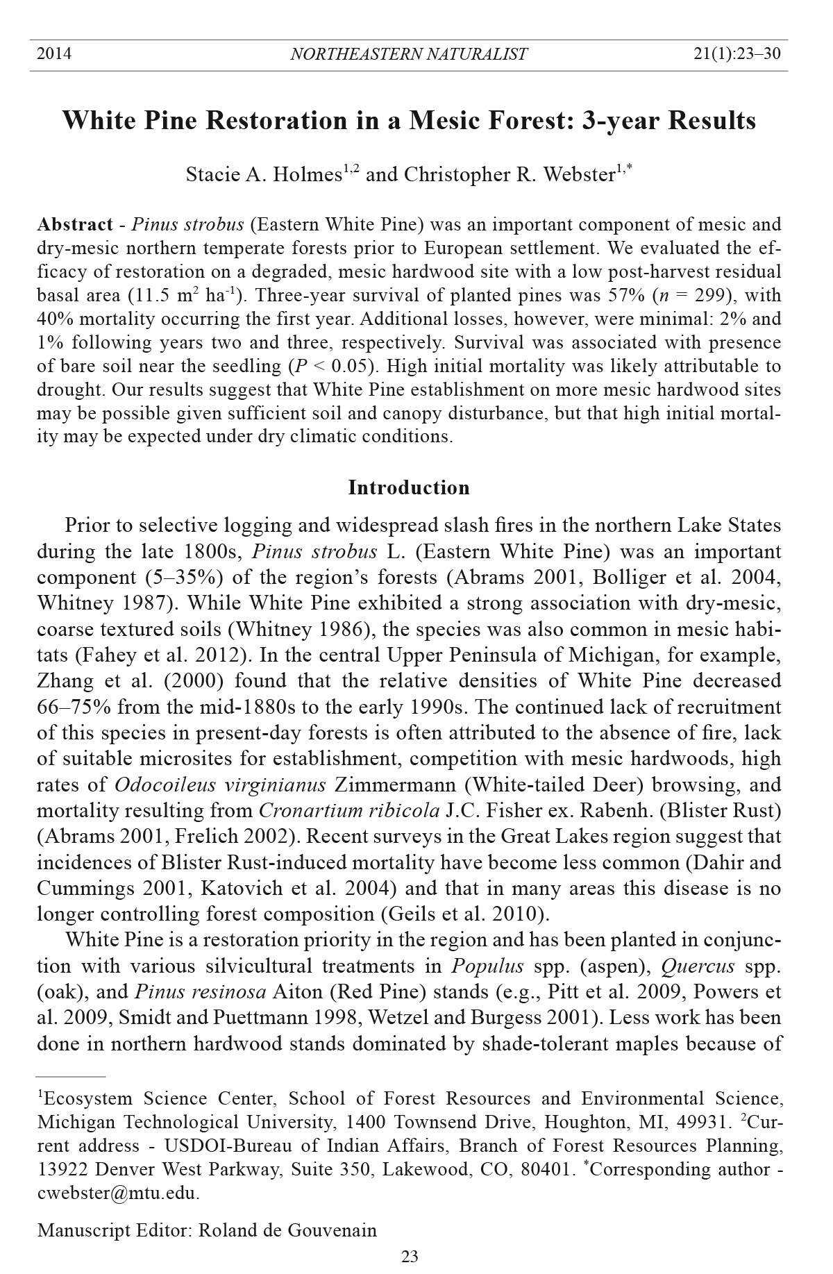 White Pine Restoration in a Mesic Forest: 3-year Results
