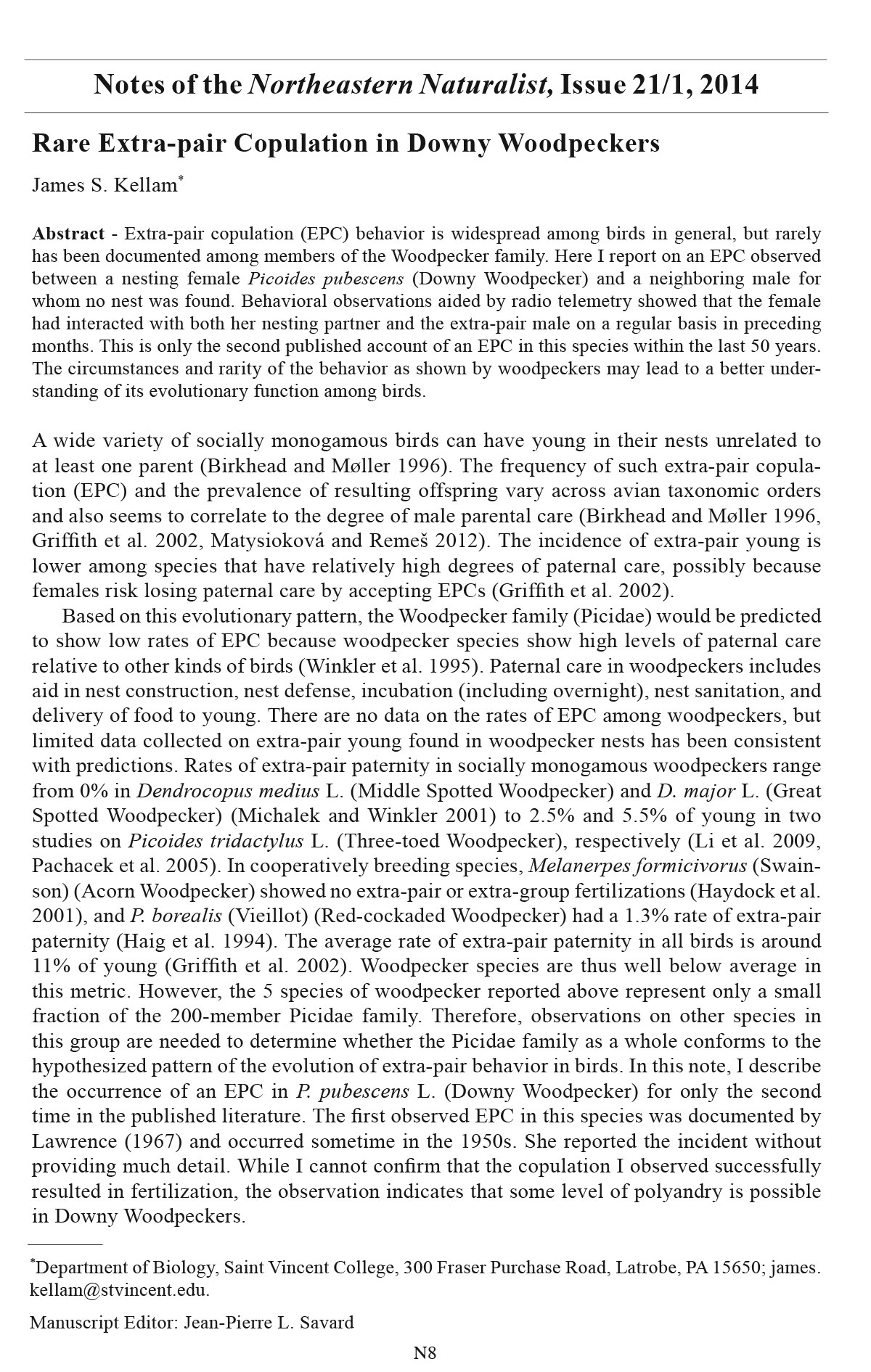 the occurrence of an EPC in P. pubescens L. (Downy Woodpecker) for only the second
