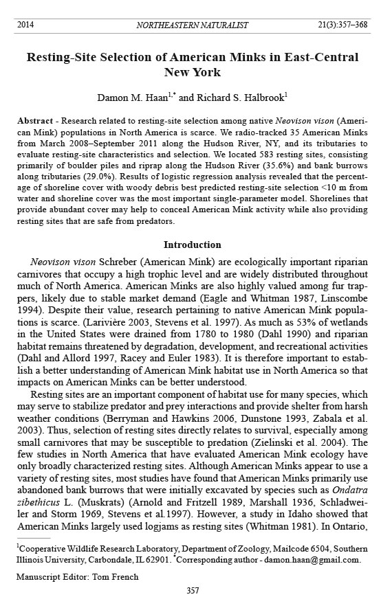 Abstract - Research related to resting-site selection among native Neovison vison (American
