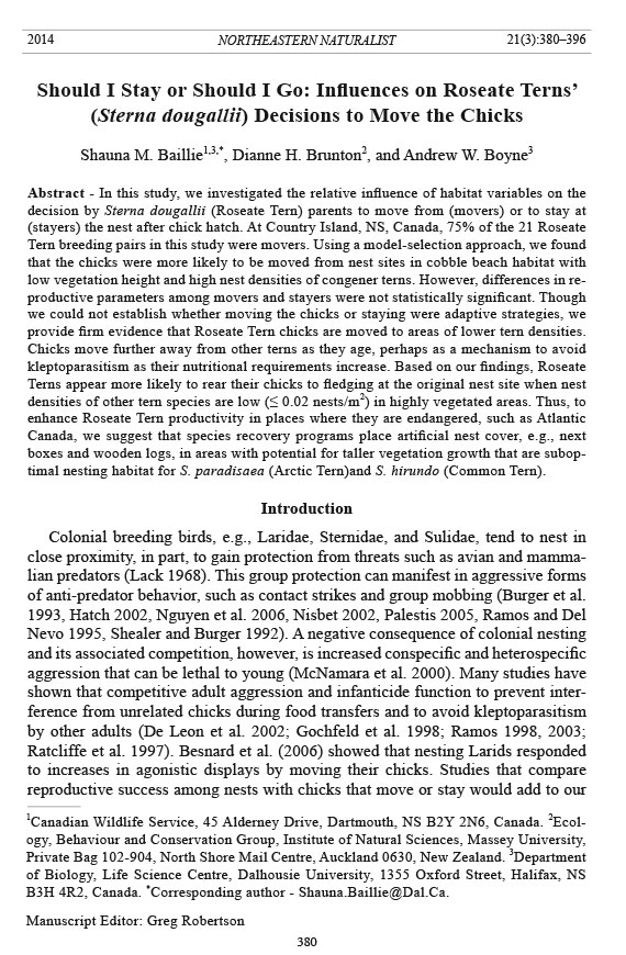 Scotia Department of Natural Resources, Dalhousie University, the Canadian Roseate Tern