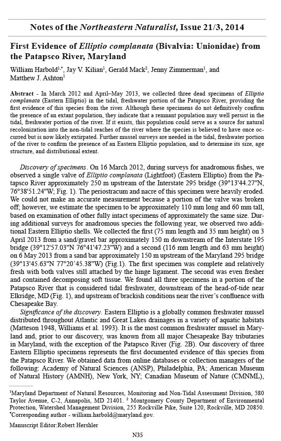 2013. Newly documented host fishes for the Eastern Elliptio Mussel ( Elliptio complanata). Journal