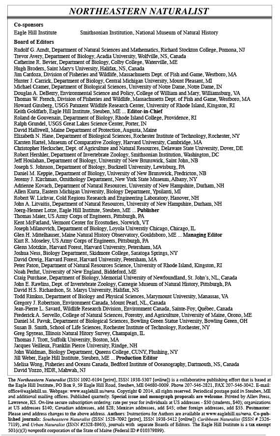 Board of Editors and Indicia of the Northeastern Naturalist, Volume 21, Number 4, 2014