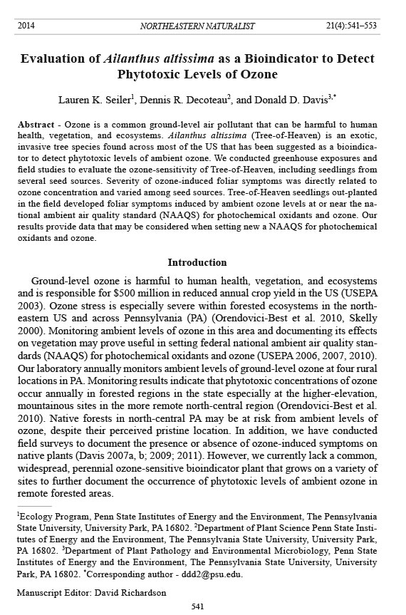 Kasson, M.T., M.D. Davis, and D.D. Davis. 2013. The invasive Ailanthus altissima in