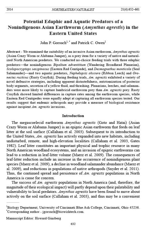 Abstract - We examined the suitability of an invasive Asian earthworm, Amynthas agrestis