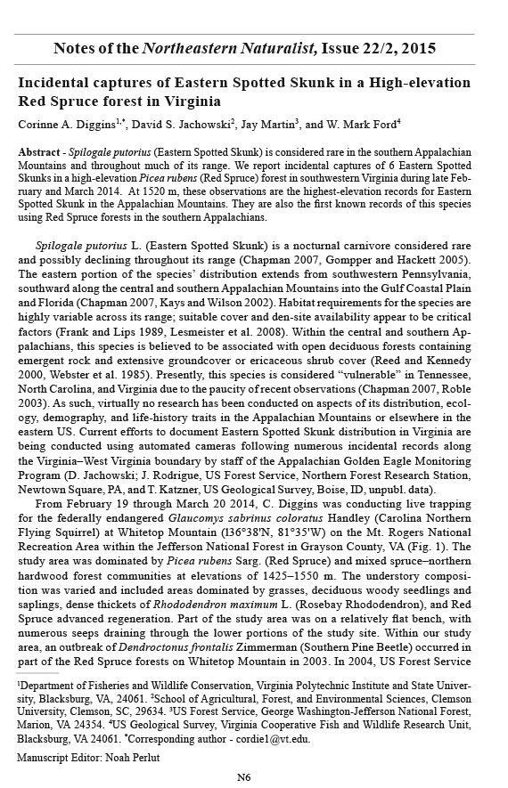 Abstract - Spilogale putorius (Eastern Spotted Skunk) is considered rare in the southern Appalachian