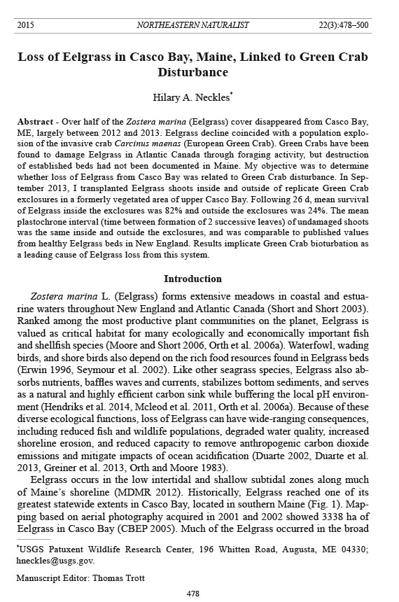 Loss of Eelgrass in Casco Bay, Maine, Linked to Green Crab