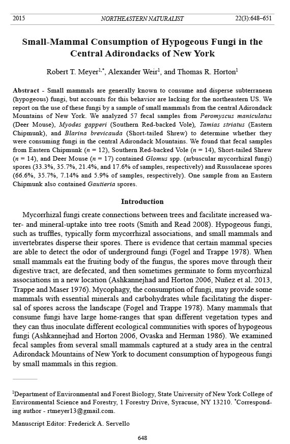 report on the use of these fungi by a sample of small mammals from the central Adirondack