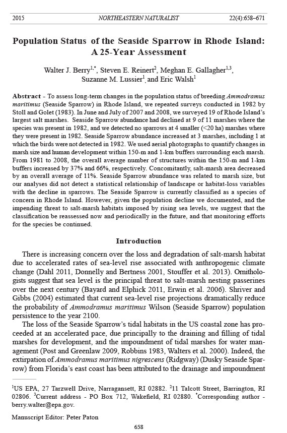 Stoll, M.J., and F.C. Golet. 1983. Status of the Seaside Sparrow in Rhode Island. Audubon