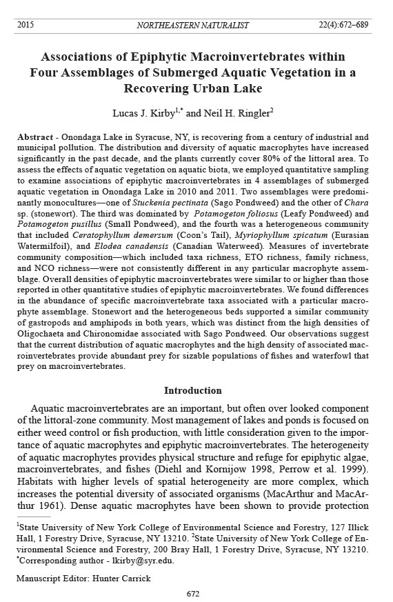 Kirby, L.J. 2013. Recolonization of macroinvertebrates in a recovering urban lake (Onondaga