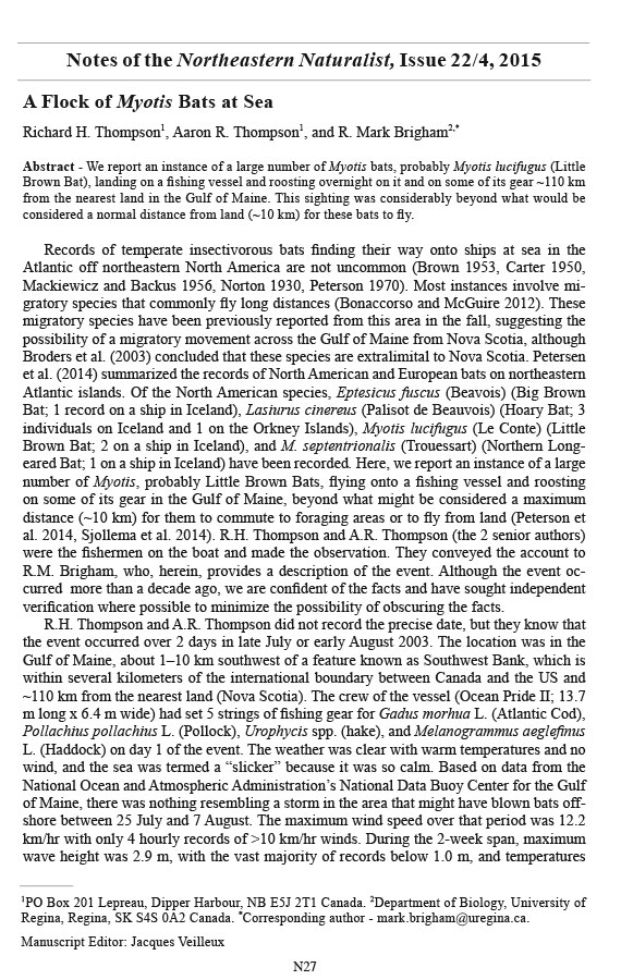 Brown, N.R. 1953. An addition to the list of mammals of Nova Scotia: The Eastern Red Bat. Canadian