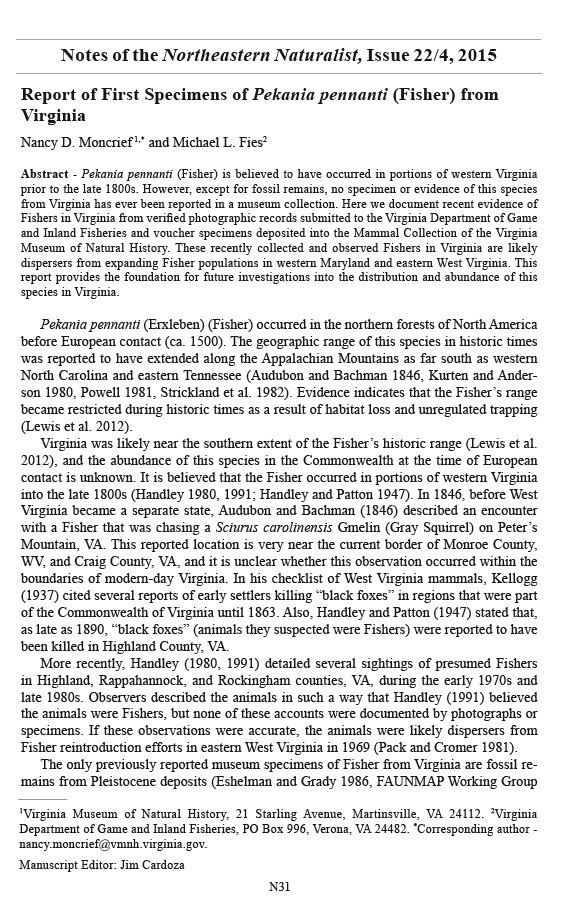 Museum of Natural History. These recently collected and observed Fishers in Virginia are likely