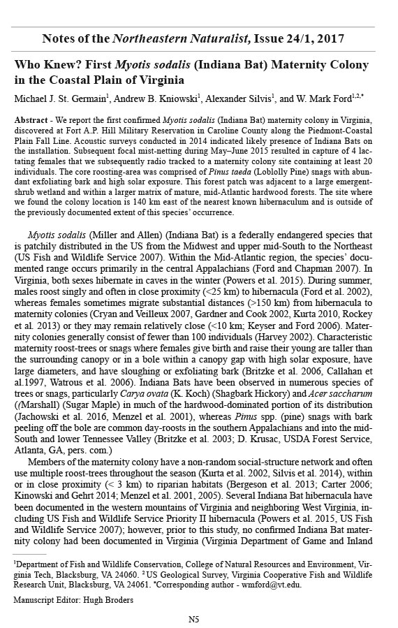 Who Knew? First Myotis sodalis (Indiana Bat) Maternity Colony