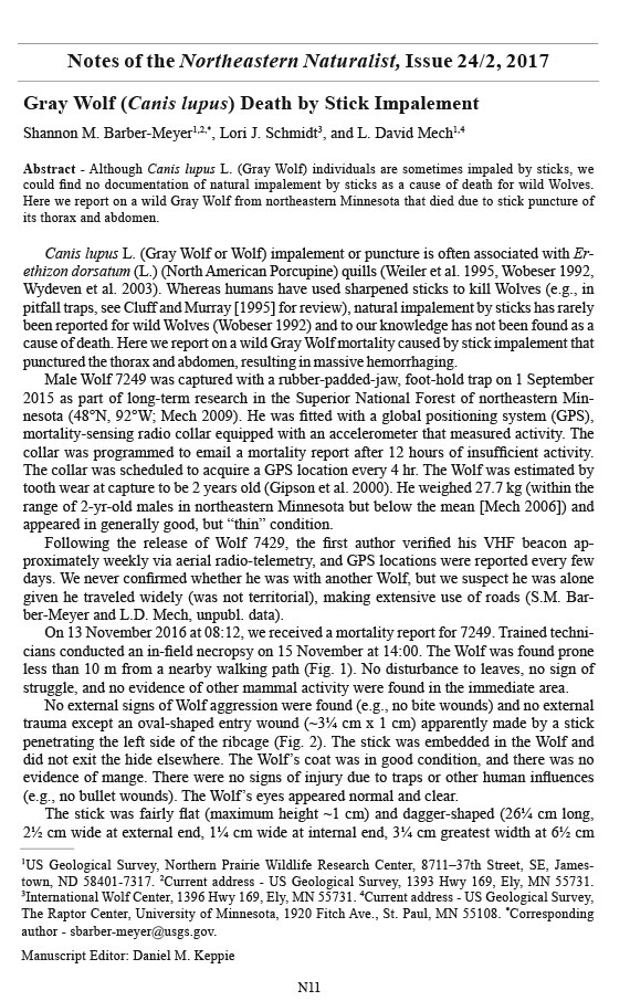 Here we report on a wild Gray Wolf from northeastern Minnesota that died due to stick puncture of