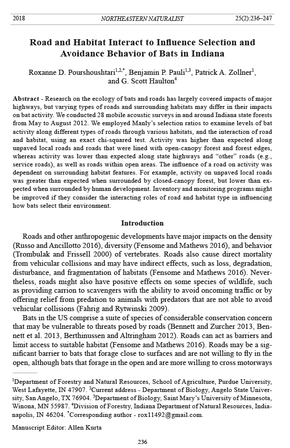 Bennett, V.J., D.W. Sparks, and P.A. Zollner. 2013. Modeling the indirect effects of road