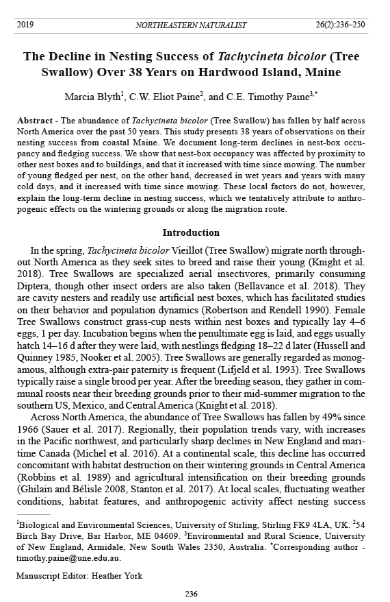 observations on Tree Swallow breeding, over which time nesting success declined