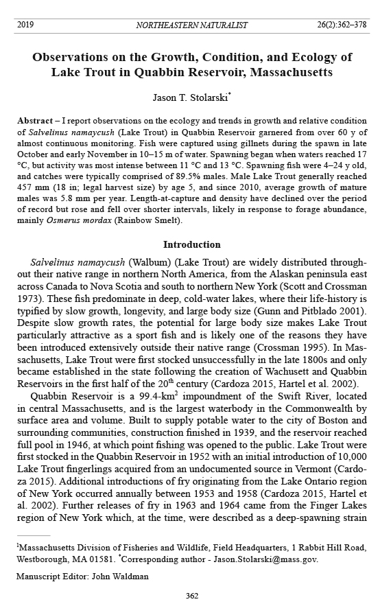 of Salvelinus namaycush (Lake Trout) in Quabbin Reservoir garnered from over 60 y of