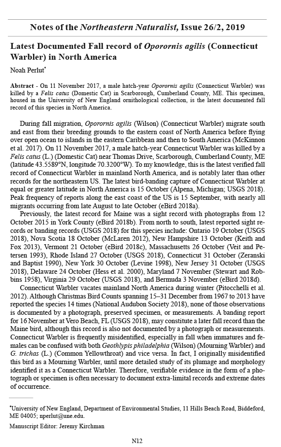 et al. 2017). On 11 November 2017, a male hatch-year Connecticut Warbler was killed by a