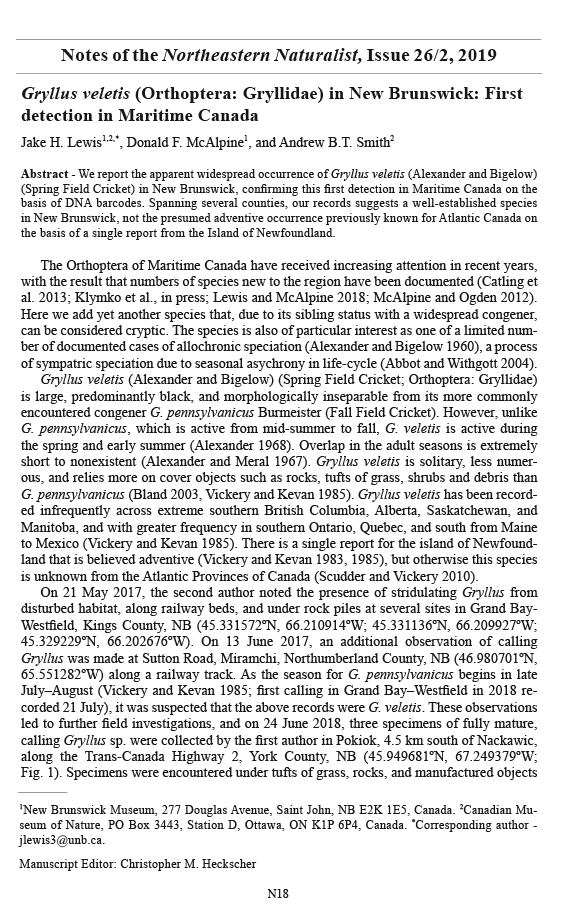 (Spring Field Cricket) in New Brunswick, confirming this first detection in Maritime Canada on the
