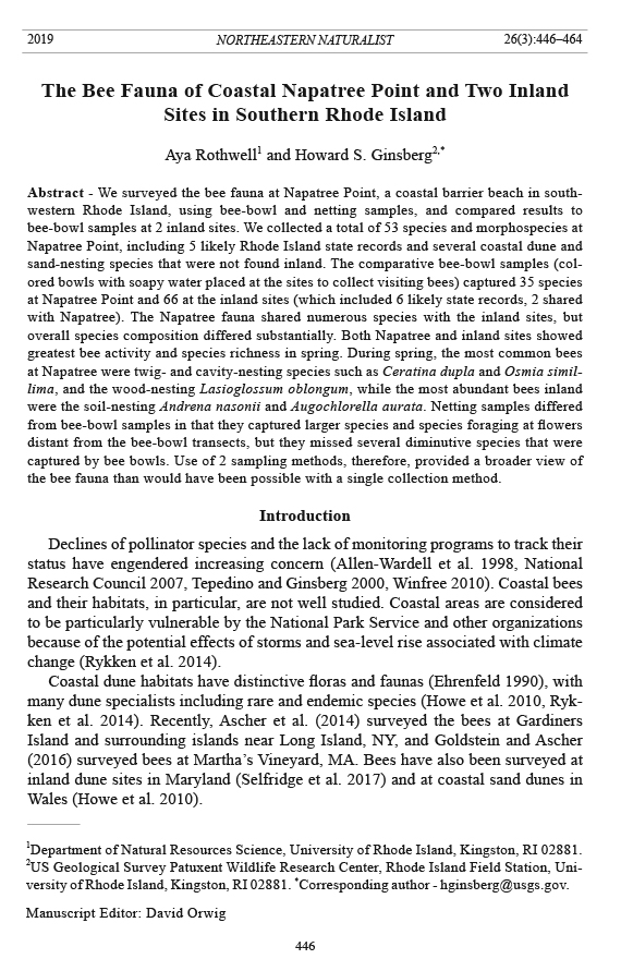 Abstract - We surveyed the bee fauna at Napatree Point, a coastal barrier beach in southwestern
