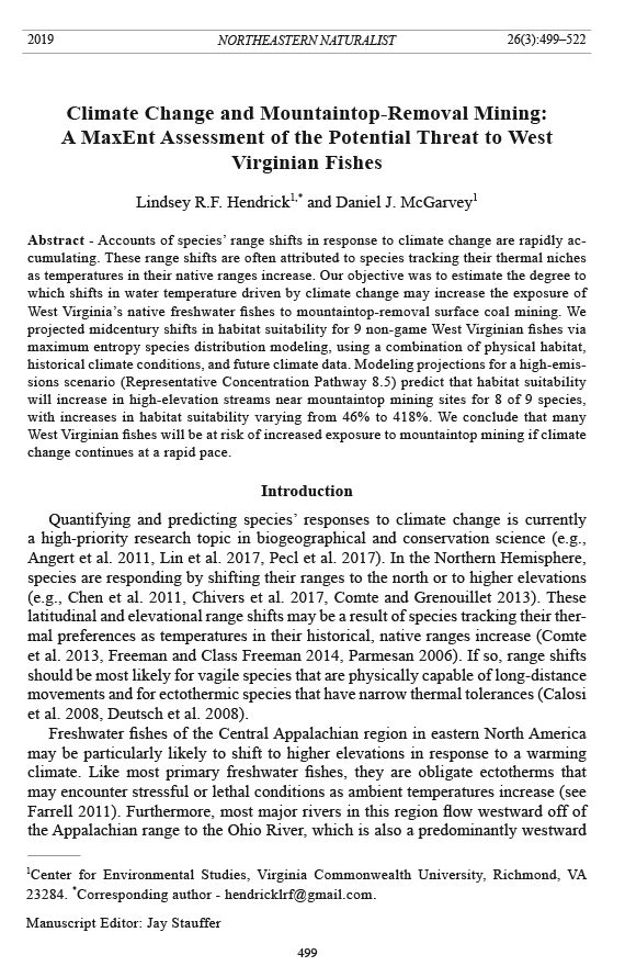 West Virginian fishes will be at risk of increased exposure to mountaintop mining if climate
