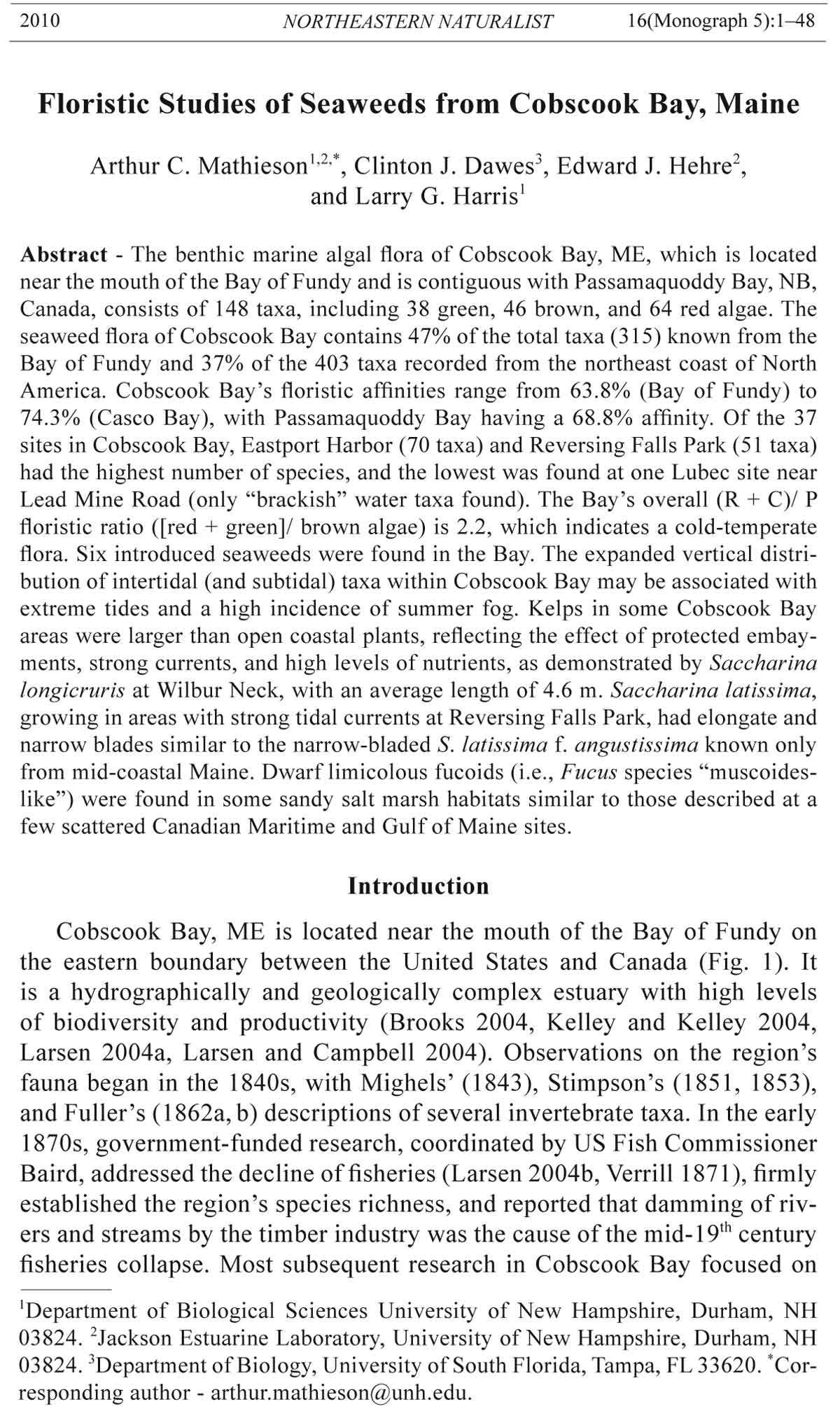 Floristic Studies of Seaweeds from Cobscook Bay, Maine