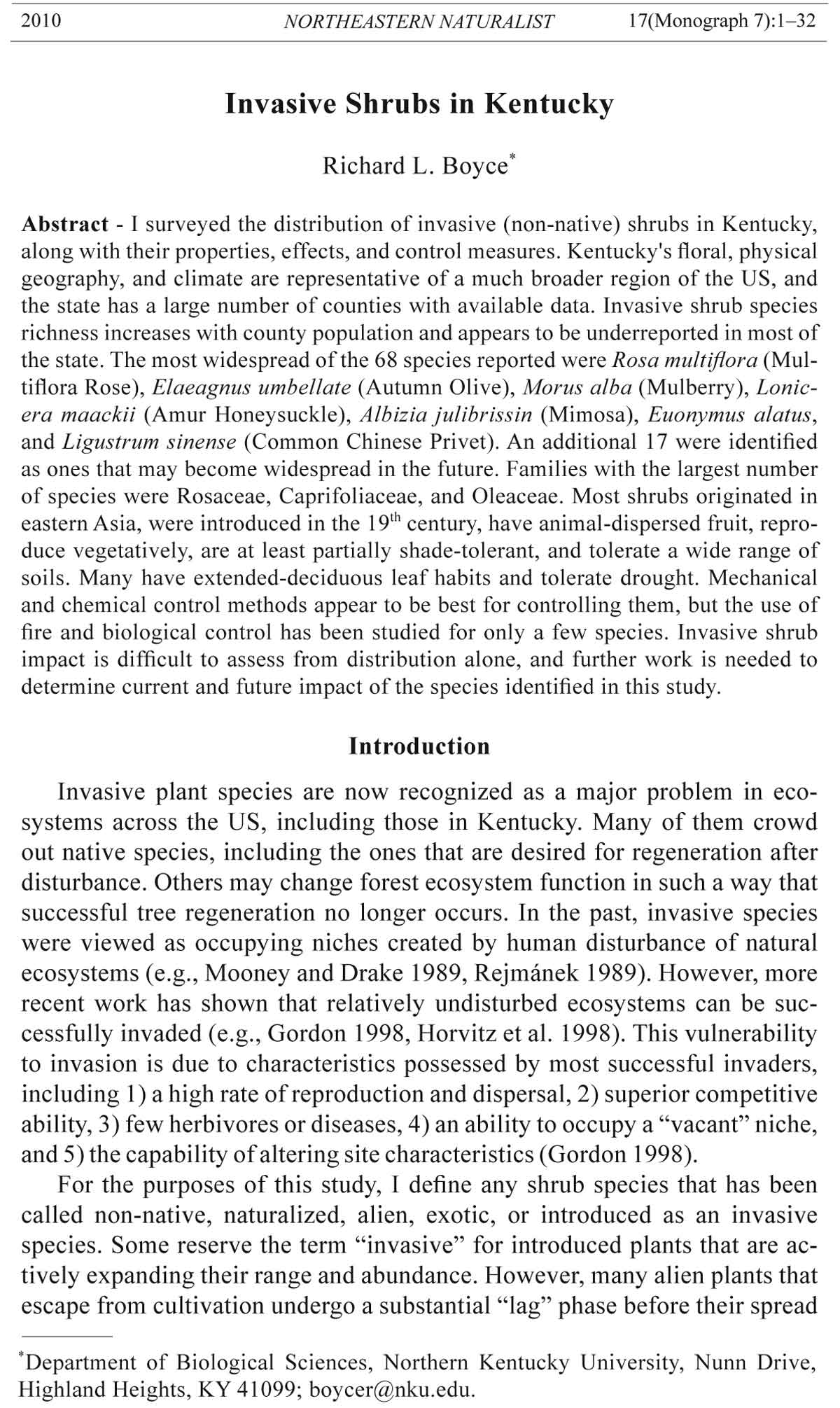 Abstract - I surveyed the distribution of invasive (non-native) shrubs in Kentucky,