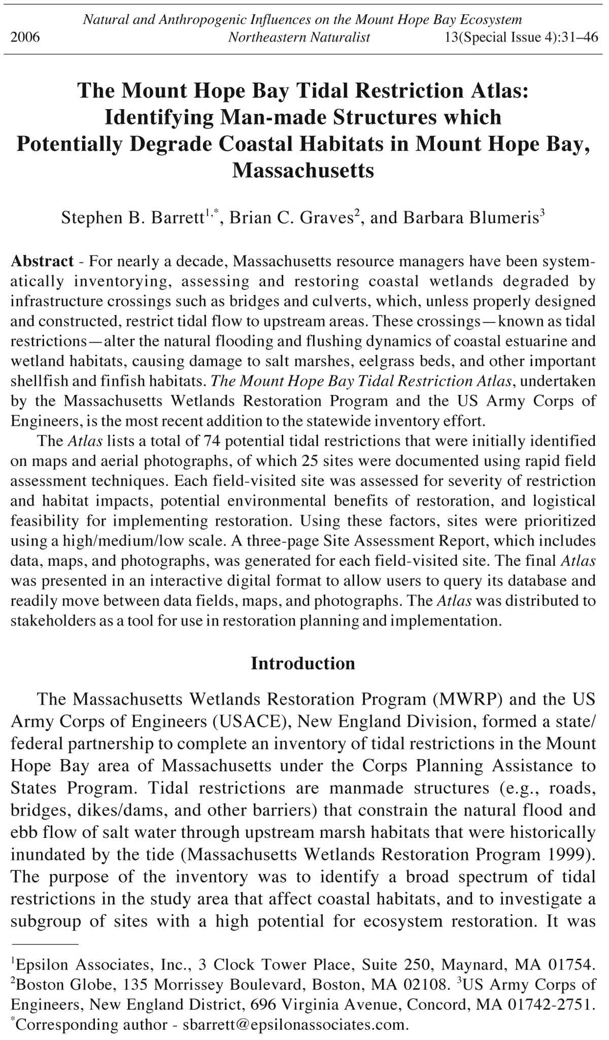 shellfish and finfish habitats. The Mount Hope Bay Tidal Restriction Atlas, undertaken