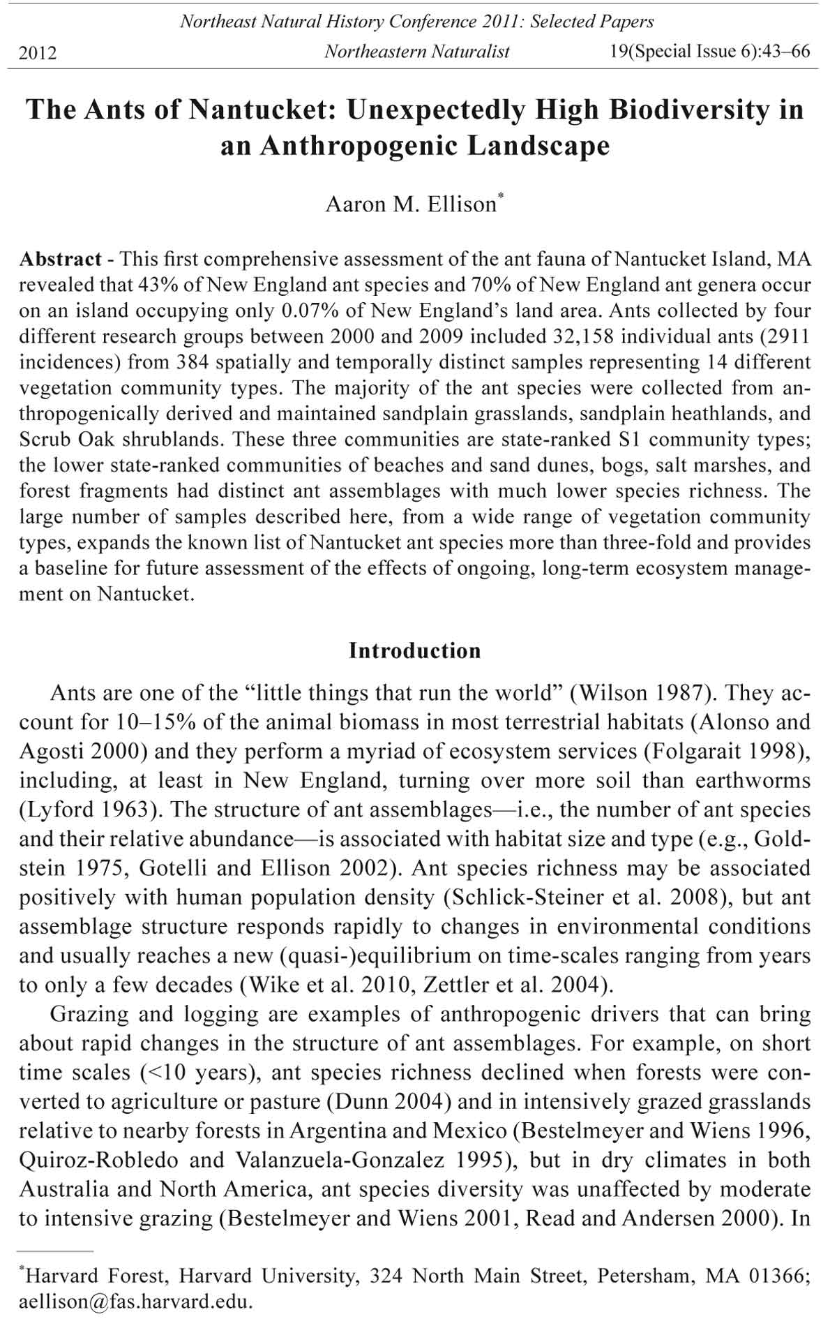 Abstract - This first comprehensive assessment of the ant fauna of Nantucket Island, MA