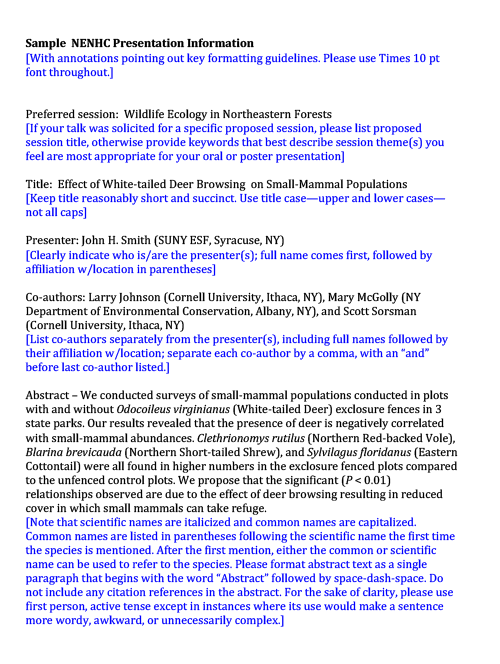 In addition to submitting your presentation information as part of the online registration form, please also send the abstract, formatted as described below, as a Word file to keithg@eaglehill.us. Use "[your last name and first initial]-NENHC 2026-Oral Presentation" as both the title of the file and as the email subject line. This will help ensure we get all of your information correct while minimizing the need for follow-up contact.